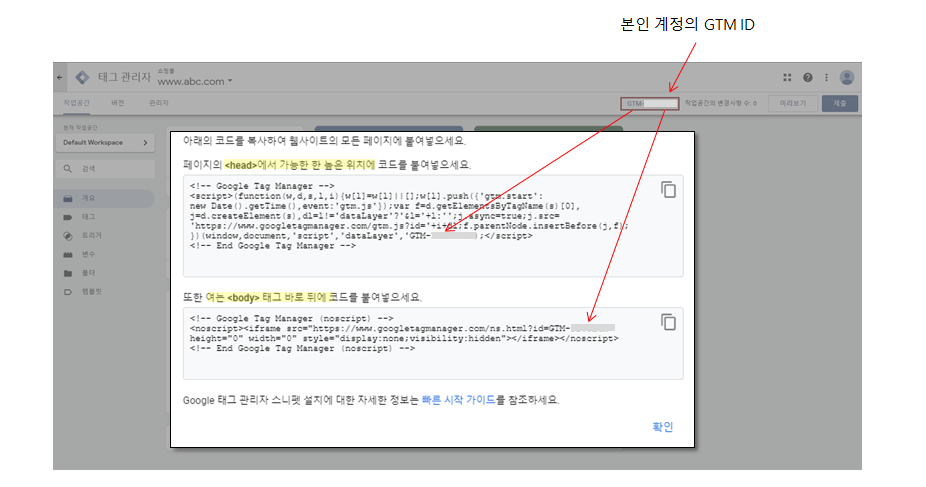 2. 트래킹 할 웹사이트에 GTM 공통 스크립트 삽입 (이건 개발자나 호스팅사에게 부탁)