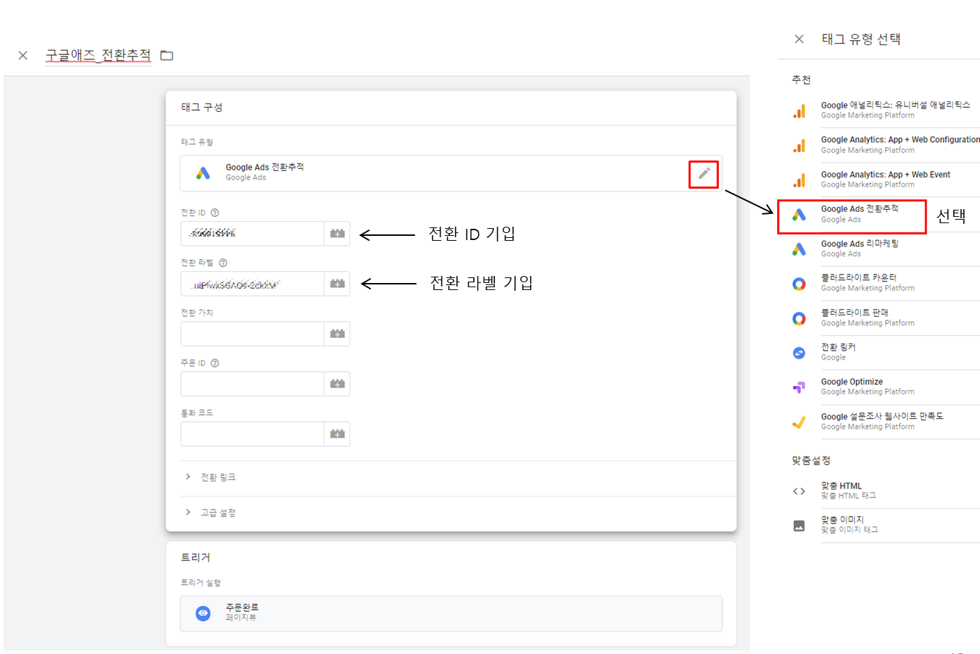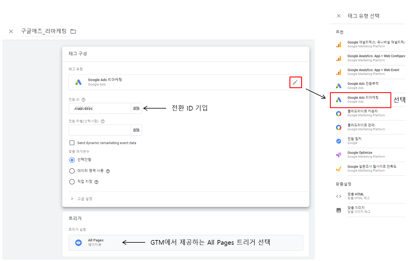 2. 태그매니저 내에서 GA 추적태그, 구글애드워즈 리마케팅, 전환추적 태그 설정