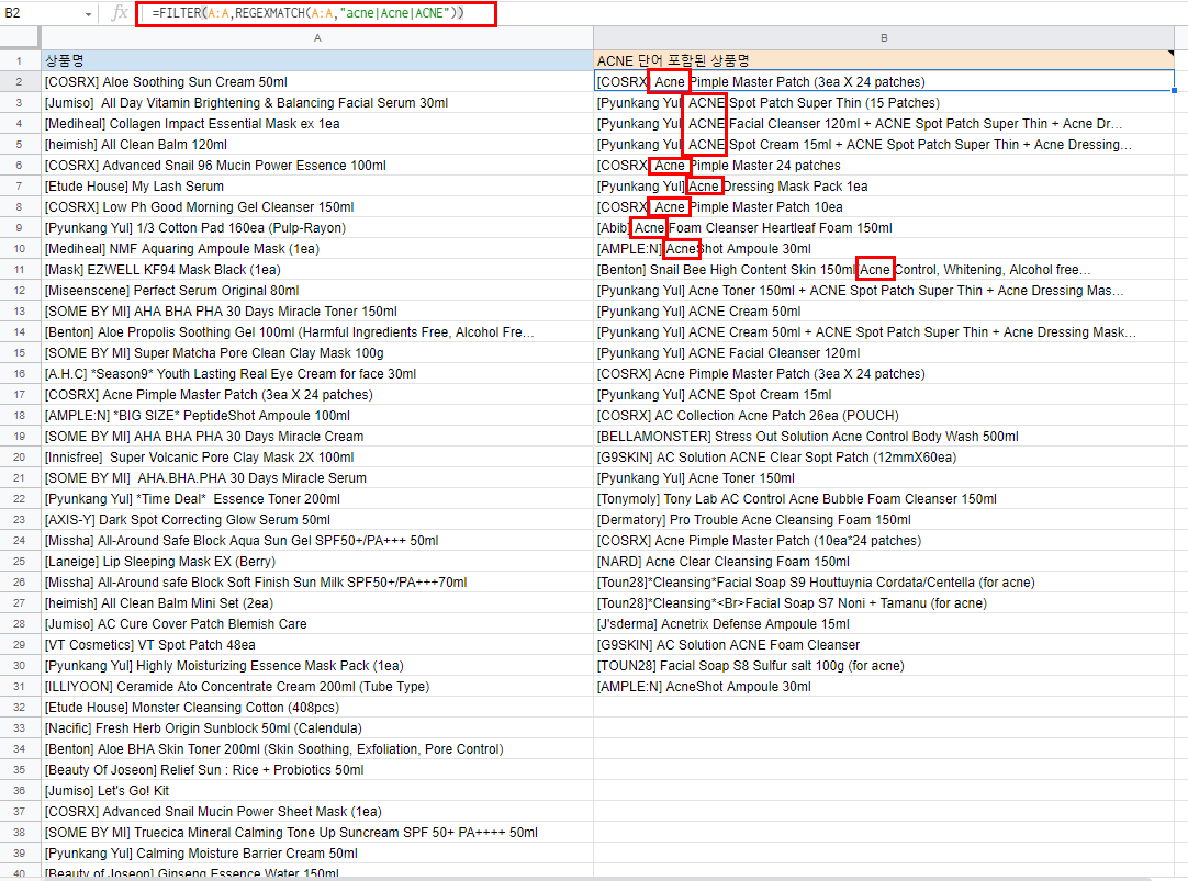 =FILTER(A:A,REGEXMATCH(A:A,"acne"))